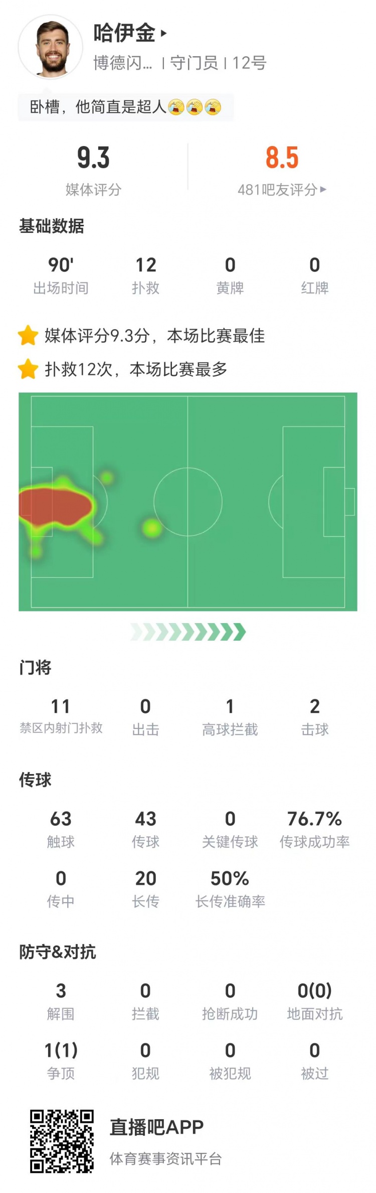 赛后时刻统计数据裸露,哈伊金本场比赛共有12次扑救,其中11次王人是靠近尤文禁区内的射门。另外,他还有3次突围。
