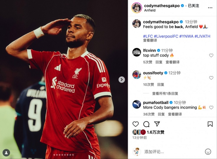 赛后,加克波更新社媒抒发了回到主场作战的应承。这位荷兰时尚社媒写说念:回到安菲尔德的嗅觉真好 ❤️🙏🏾