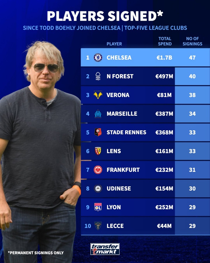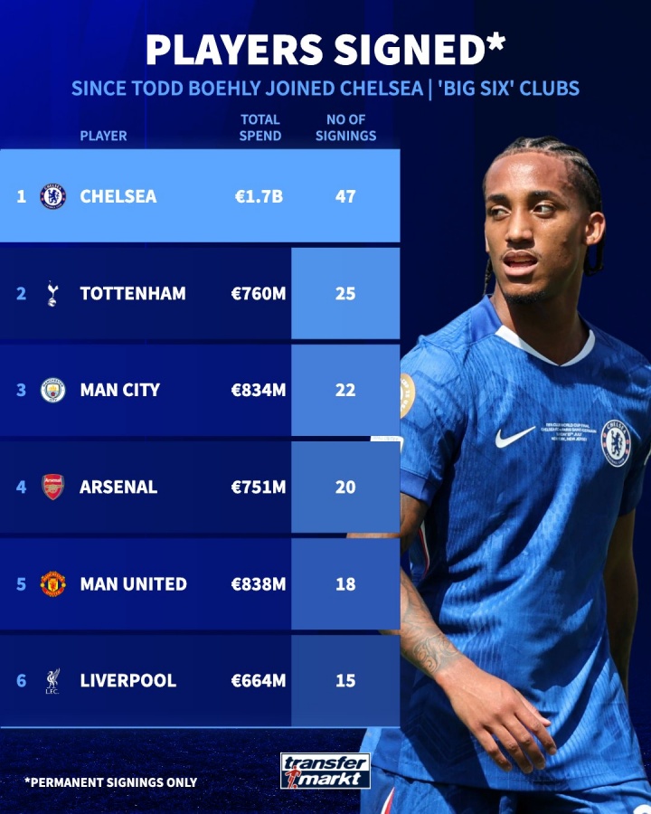 英超big6引援用度及东谈主数:切尔西破耗17亿欧签下47名球员,断档特出↓