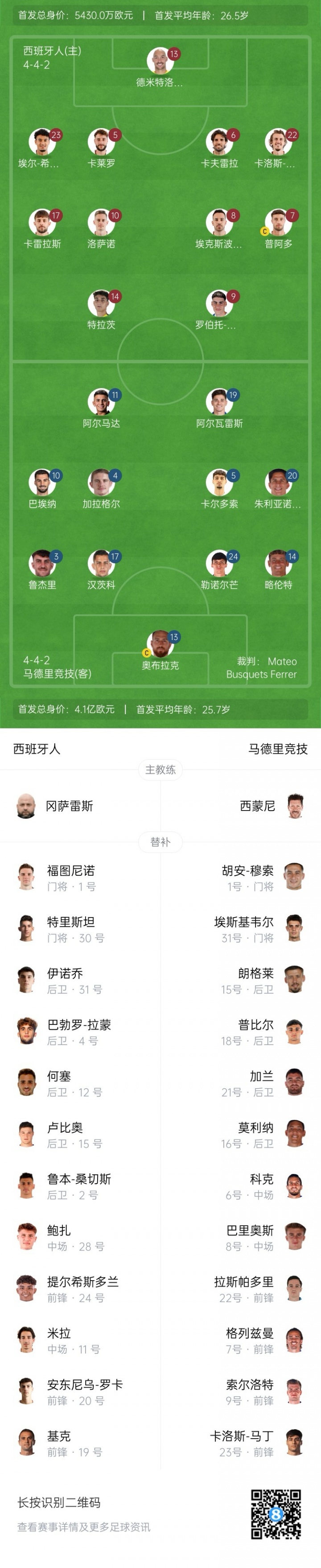 马竞首发:13-奥布拉克、3-马特奥-鲁杰里、14-马科斯-略伦特、17-汉茨科、24-勒诺尔芒、4-加拉格尔、5-卡尔多索、11-阿尔马达、20-朱利亚诺-西蒙尼、10-巴埃纳、19-阿尔瓦雷斯