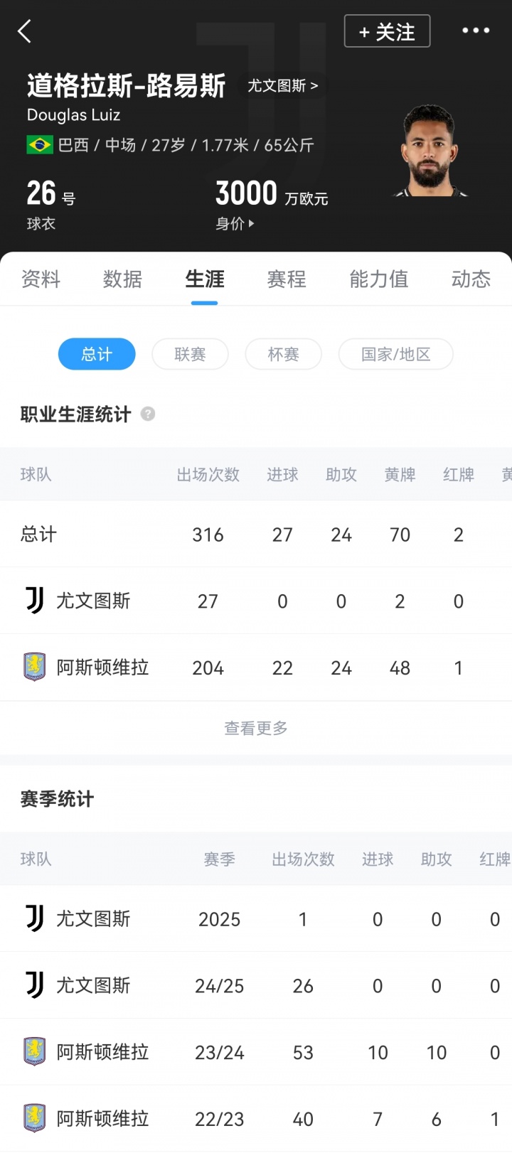 说念格拉斯-路易斯旧年夏窗以5150万欧元的转会费从维拉加盟尤文,但统共这个词2024/25赛季,说念格拉斯-路易斯只出场26次,莫得孝顺任何进球或助攻。