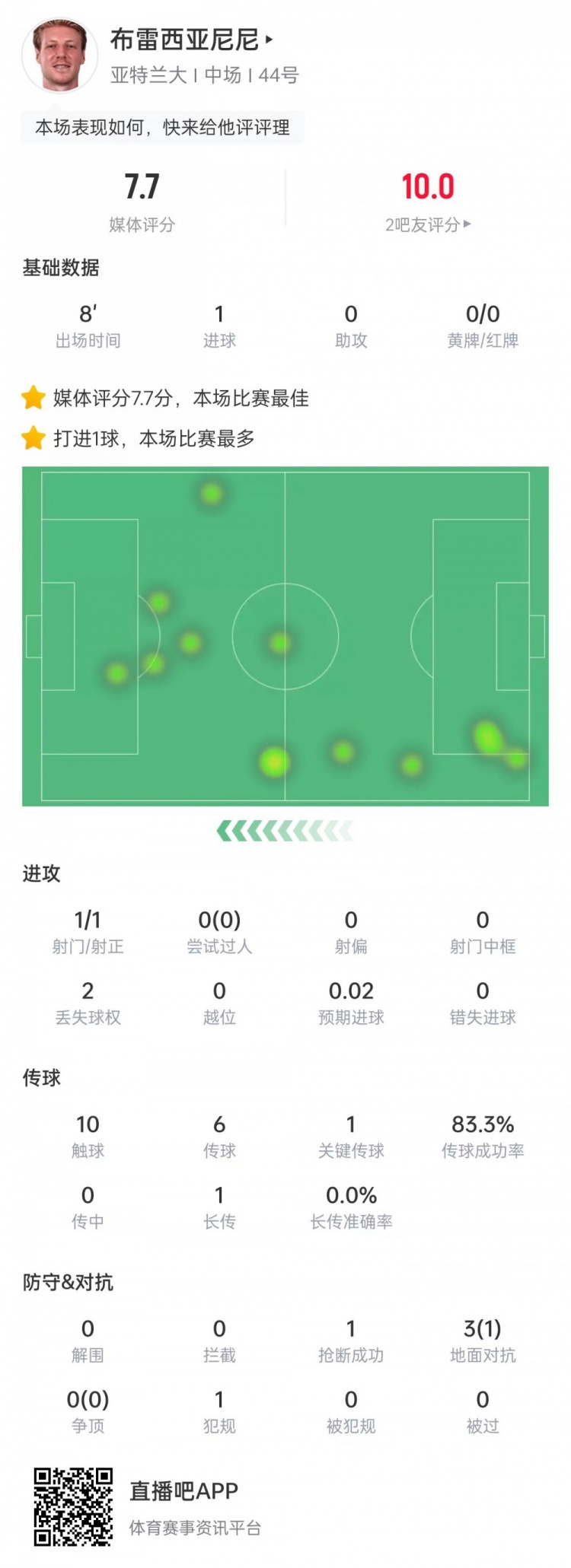 此役布雷西亚尼尼替补出场,为亚特兰大攻入扳平比分的进球,意甲官方通知,他当选本场比赛最好球员。