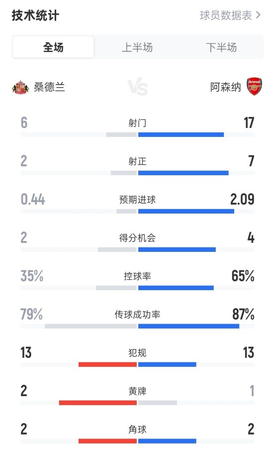 桑德兰2-2阿森纳全场数据:射门6-17,射正2-7,控球率35%-65%