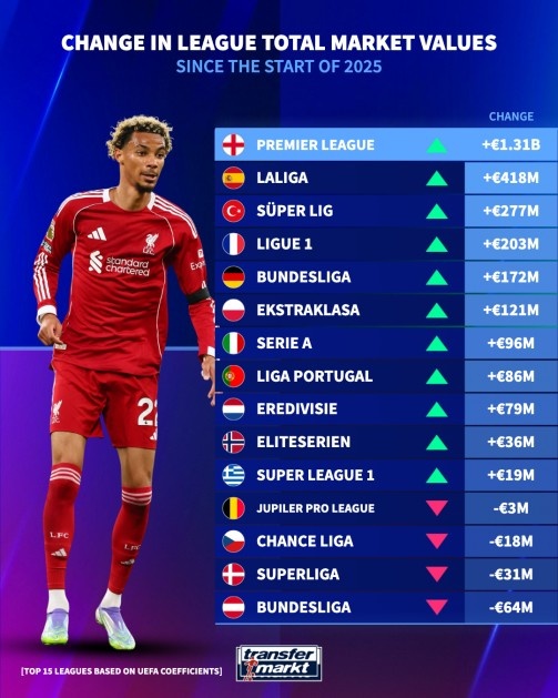 欧洲联赛本年身价变动:英超+13.1亿欧最多,西甲+4.18亿欧次席