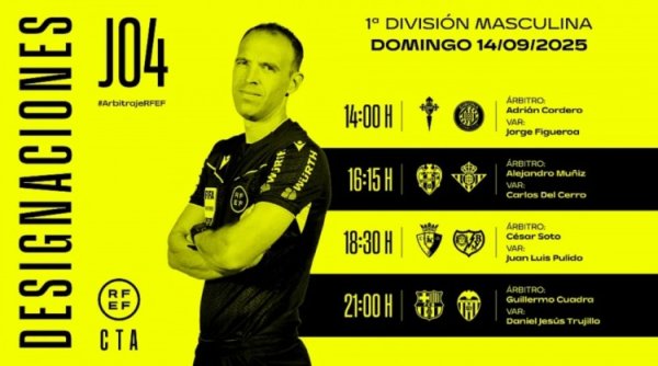 9月13日讯 当地工夫周日(9月14日)进行的西甲第4轮四场比赛裁判仍是细则,具体任命如下: 9月14日20:00 塞尔塔vs赫罗纳 主裁判:阿德里安-科尔德罗 VAR:豪尔赫-菲格罗亚 9月14日22:15 莱万特vs贝蒂斯 主裁判:亚历杭德罗-穆尼斯 VAR:卡洛斯-德尔塞罗 9月15日0:30 奥萨苏纳vs巴列卡诺 主裁判:塞萨尔-索托 VAR:胡安-路易斯-普利多 9月15日3:00 巴萨vs瓦伦西亚 主裁判:吉列尔莫-夸德拉 VAR:丹尼尔-热苏斯-特鲁希略......查看更多