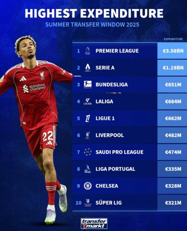 9月2日讯 今夏主流联赛转会窗还是关闭,《转会市集》也统计了各大联赛的支拨情况,值得一提的是利物浦和切尔西手脚单一球队也被列入名次。 2025夏日转会窗各联赛支拨支拨榜: 1. 英超 35.8亿欧元 2. 意甲 11.9亿欧元 3. 德甲 8.51亿欧元 4. 西甲 6.84亿欧元 5. 法甲 6.62亿欧元 6. 利物浦 4.82亿欧元 7. 沙超 4.74亿欧元 8. 葡超 3.35亿欧元 9. 切尔西 3.28亿欧元 10. 土超 3.21亿欧元......查看更多