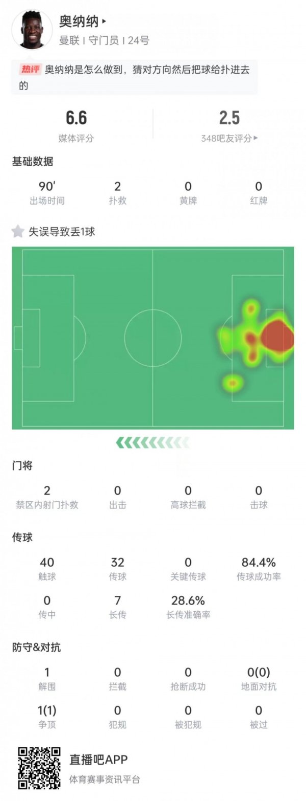 奥纳纳本场数据:作念出2次扑救&出击过失导致丢球,获评6.6分