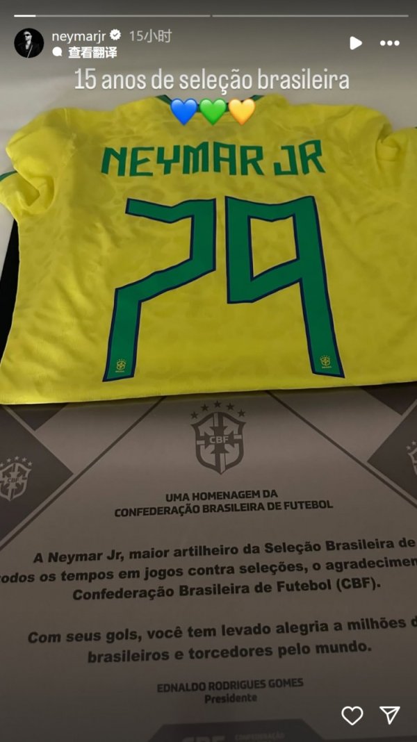 巴西队首秀15周年!内马尔社媒晒国度队79球总结球衣