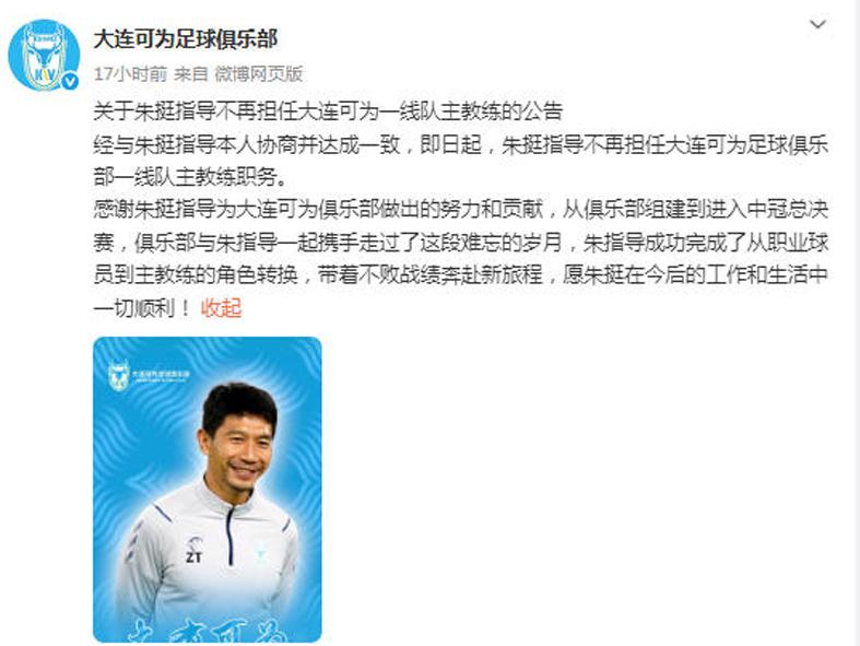 朱挺自宣:由于战绩欠安,未达到俱乐部预期表率,经与大连可为俱乐部协商:即日起,本东谈主不再担任大连可为俱乐部主莳植职位。朱挺写谈:“一同斗争10轮谨慎比赛,共6胜4平,有惊喜也有缺憾,更多的是对我方才气不及的错愕害怕,畴昔一定充分学习,夯实基础,悉力普及业务水平,为大连足球作念浅陋的孝顺,少说空论多职业实,用此次贵重的联赛教化办事更多,对足球有理念念有憧憬的球员!”